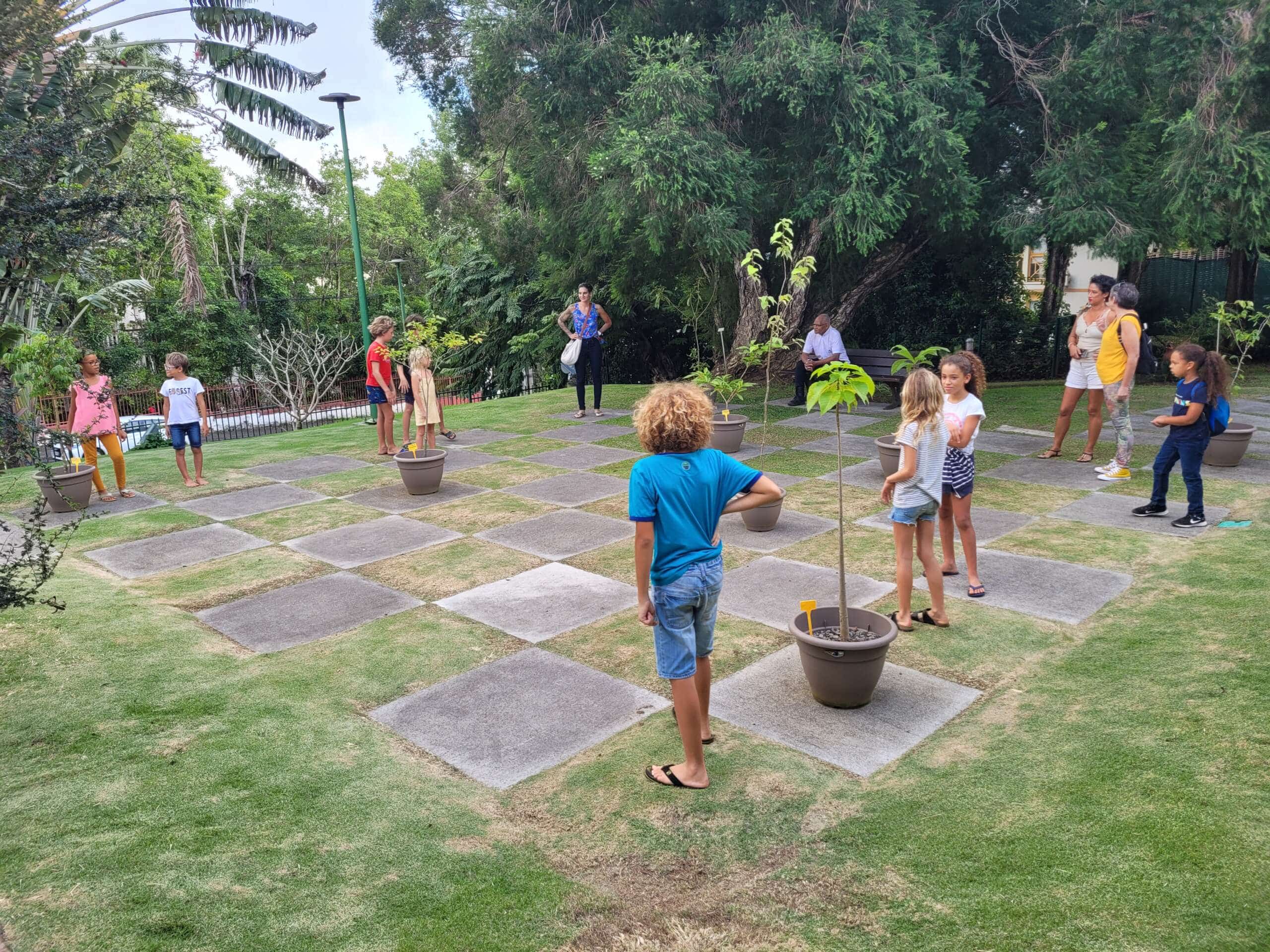 Nous avons ensuite joué à un jeu avec des espèces différentes dedans comme par exemple, il fallait imiter un poisson ou trouver ce qu’est l’animal sur la photo. Après avoir fait quelques parties, nous avons joués à cache-cache et nous avons décidé que que l’on ne devait pas se lever d’un banc que nous avions désigné. On a ensuite essayé de jouer aux échecs sur le grand damier noir et blanc : moi je faisais le roi, Joshua faisait la tour, etc. Mais nous n’étions pas suffisamment nombreux pour faire toutes les pièces du jeu.